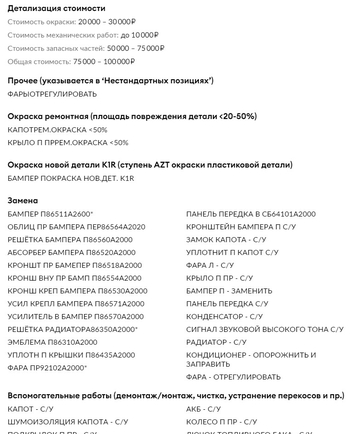 Покажу на конкретном живом примере, произошедшем лично со мной. Как то раз я попал в ДТП на заправке. Водитель Кадиллака решил сдать задним ходом, не заметил мой авто и совершил наезд. Сломал передний бампер и правую фару. ДТП мы оформили по европротоколу. Со всеми документами и фото я обратился в свою страховую компанию. Мне согласовали сумму в 39300 тысяч руб, с которой я не согласился. Ведь только фара стоила 35. Тогда страховая пересчитала и сумма выросла до 62400 тысяч. На этой сумме мы и сошлись. Но как в последствии я узнал, что такая сумма появилась за счет включения в расчет ремонтных работ еще покраски капота и крыла. Итоговая сумма по расчету вышла в 100 тысяч руб, с учетом коэфициента износа сумма выплата составила 62400 руб. При этом в отчете сейчас значится расчет ремонтных работ с более обширным списком работ нежели это было на самом деле.