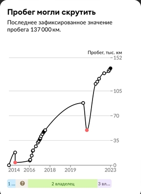 Другой частый случай неправдивой информации из отчетов, это информация о пробеге автомобиля. Раньше тех осмотр можно было сделать дистанционно без заезда на станцию и информацию в базу о пробеге заносили просто от балды. Также частенько бывает, что продавец при подаче объявления допустил ошибку при заполнении пробега. А эта информация уже попала в отчет и теперь там красуется надпись возможна скрутка пробега.