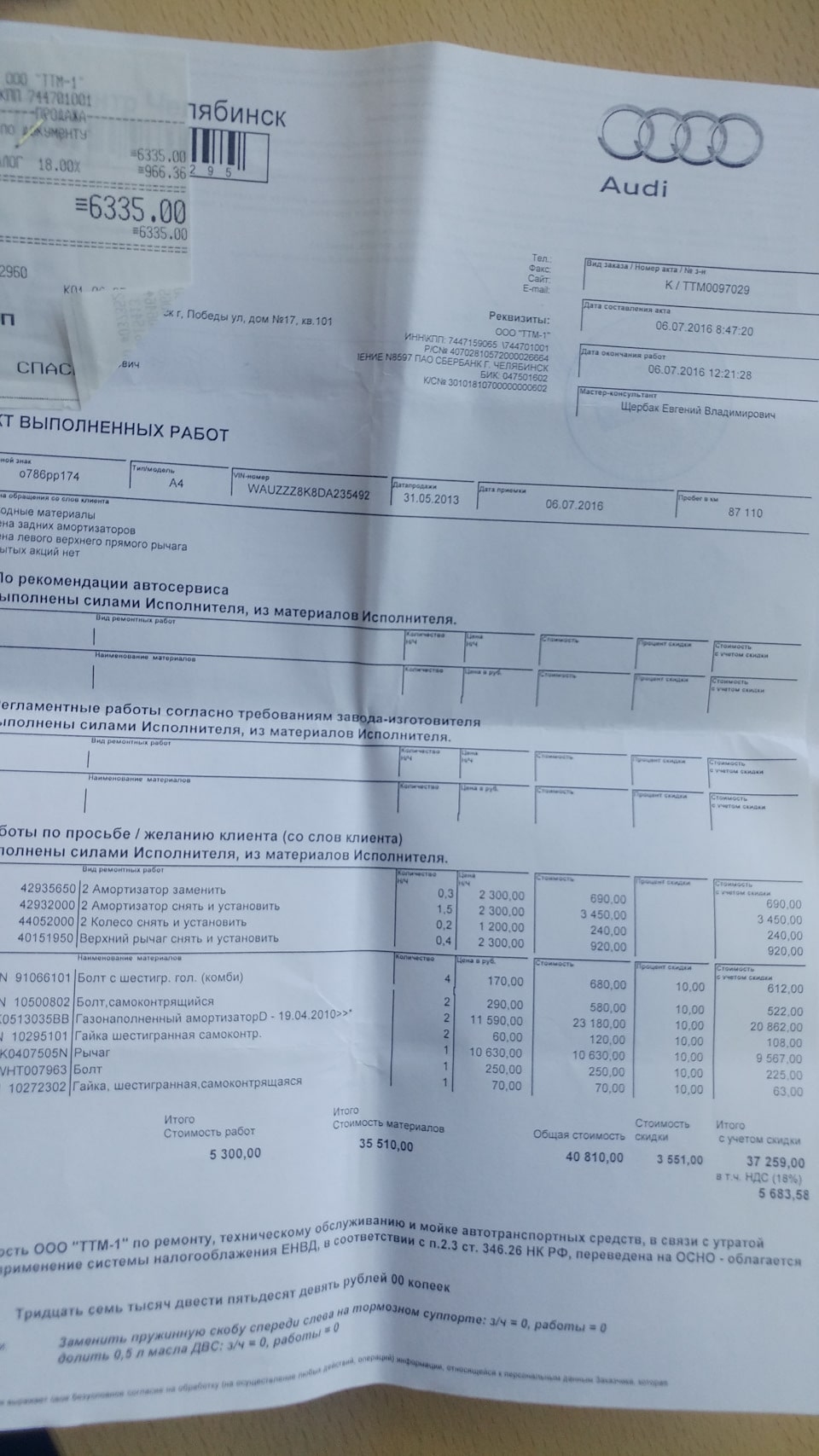 Второй чек пробег 87110 км. Владелец меняет амортизаторы и рычаг. Амортизатор стоит 11500 за штуку. Рычаг 10630 руб. Плюс всякие болтики. Итого 37259 руб.