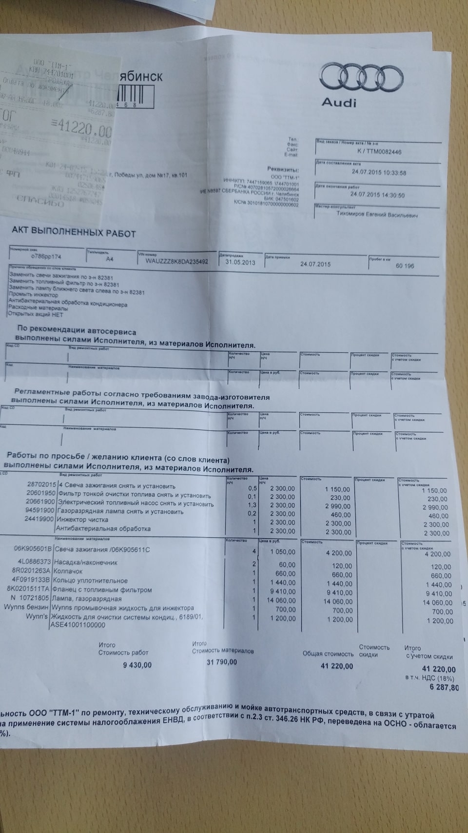 Добираемся до четвертого ТО на пробеге 60 тысяч км. Вот здесь уже начинается веселье) По регламенту на этом пробеге меняются свечи, топливный фильтр, делается чистка инжектора. Вот тут уже интересная цифра 41220 руб. У владельца перегорела ксеноновая лампа.