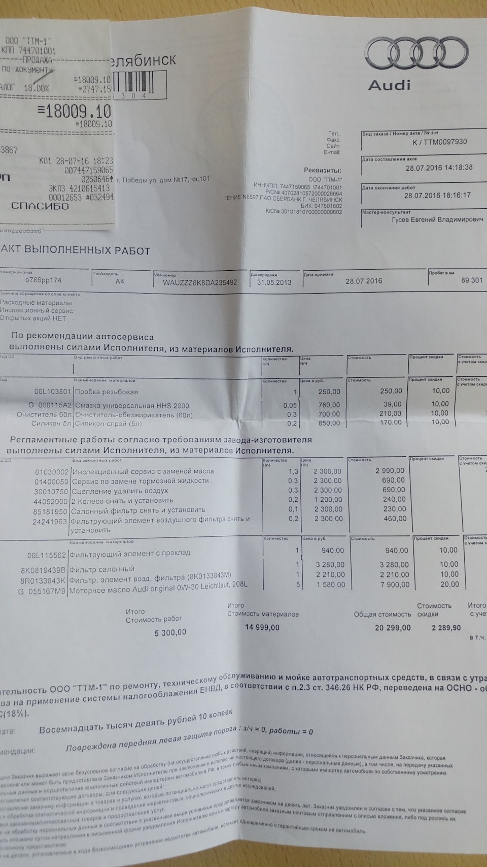 Второе ТО при пробеге 29 тысяч км уже обошлось владельцу в 21130 руб. Владелец еще покупал насадки на выхлоп стоимостью 4300 руб. Получается второе ТО нам обошлось в 16500 руб.