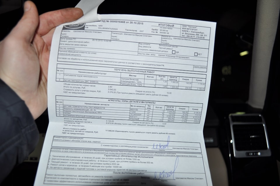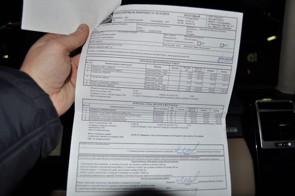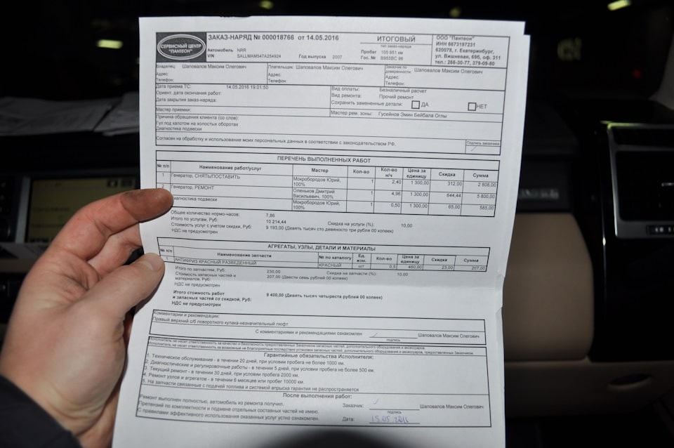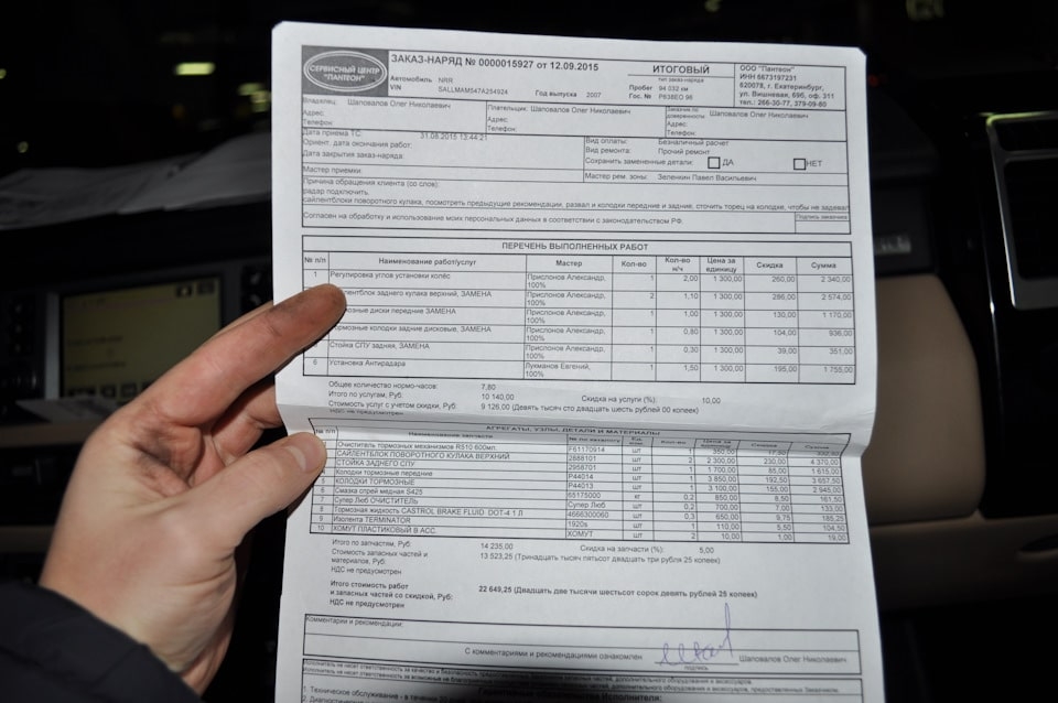 А еще в данном автомобиле за это время поменяли 4 пневмобаллона и тормозные диски. Заказ наряда по данным работам только с собой не было. Сумма работ составляла 190 тысяч руб.